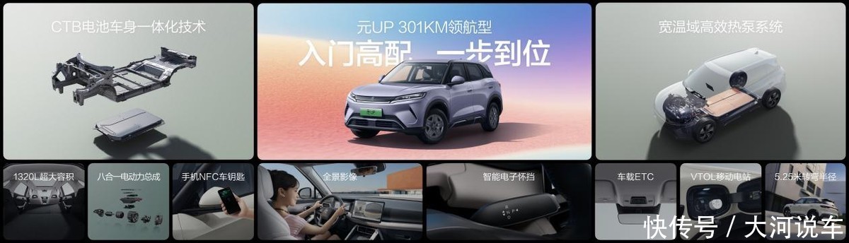 元UP 301KM领航型入门即高配,可谓诚意满满,7.48万元即可获得自动恒温空调、后排空调出风口等舒适配置,DiLink智能网联系统、智能语音交互系统等智能配置,智能上下电、VTOL移动电站等便利配置,全景影像、前排双安全气囊等安全配置。作为给年轻人准备的第一台SUV,相当够意思!